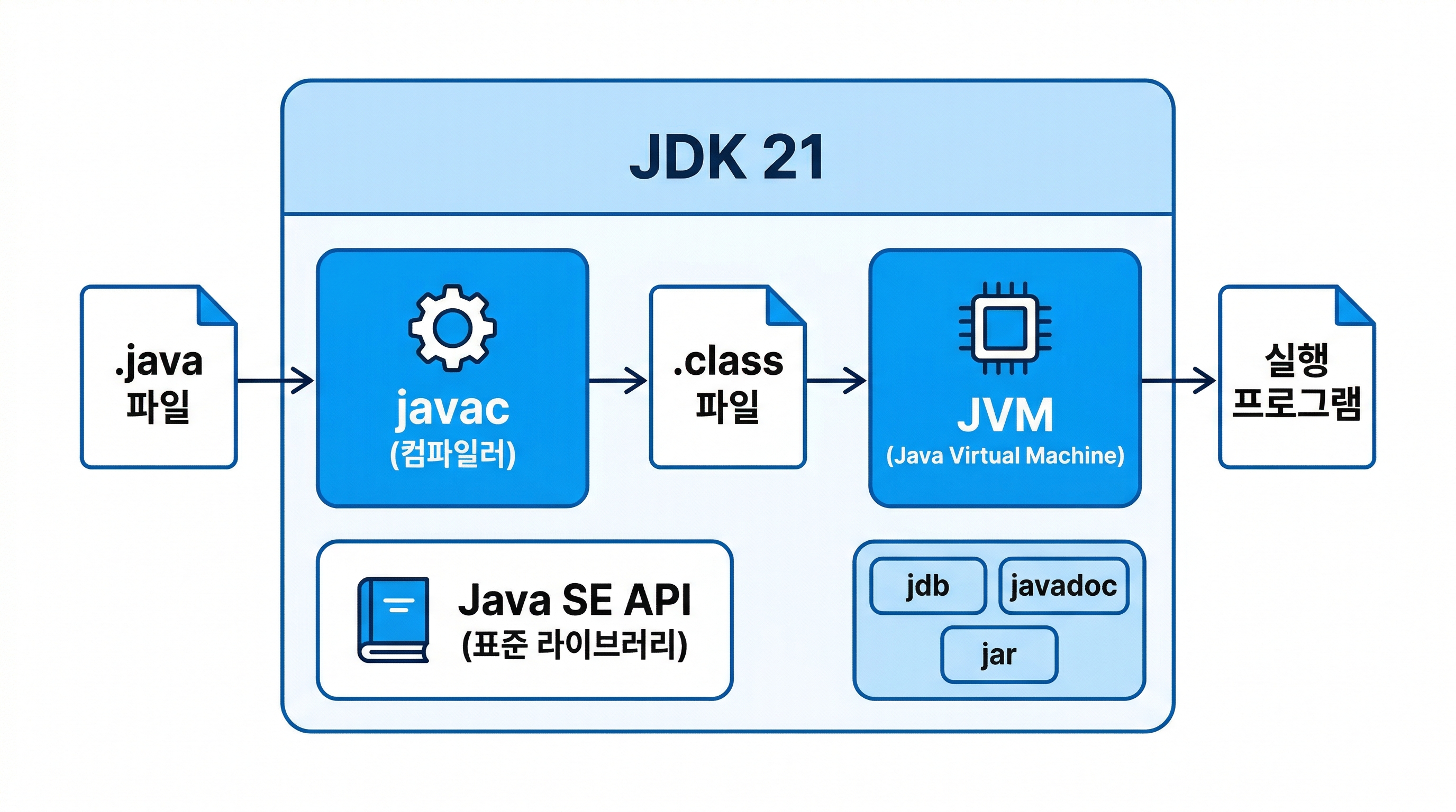 - JDK(Java Development Kit)는 컴파일러(javac), 런타임(JVM), 표준 라이브러리를 포함하는 개발 키트이다.