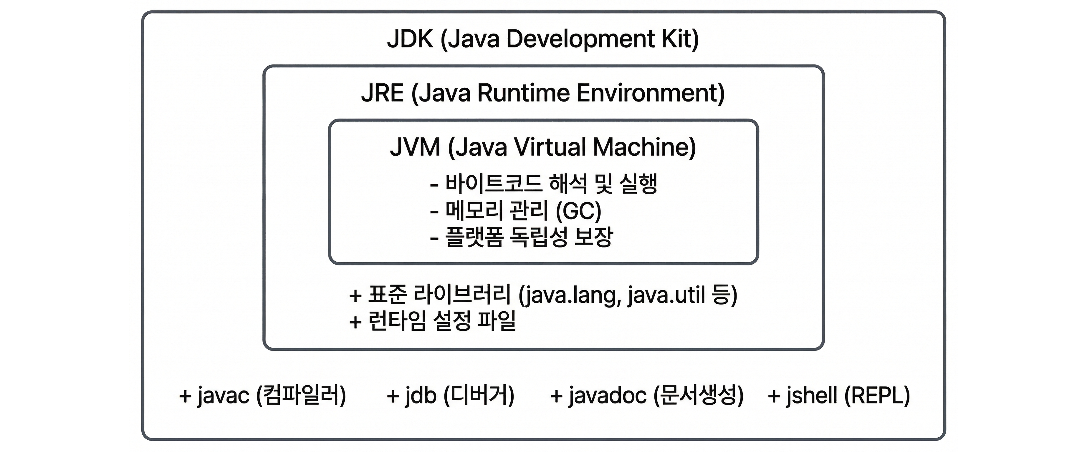 JDK (Java Development Kit)는 가장 바깥쪽으로, JRE 전체를 포함하면서 컴파일러, 디버거, 문서 생성기 등 개발 도구를 추가로 제공한다.