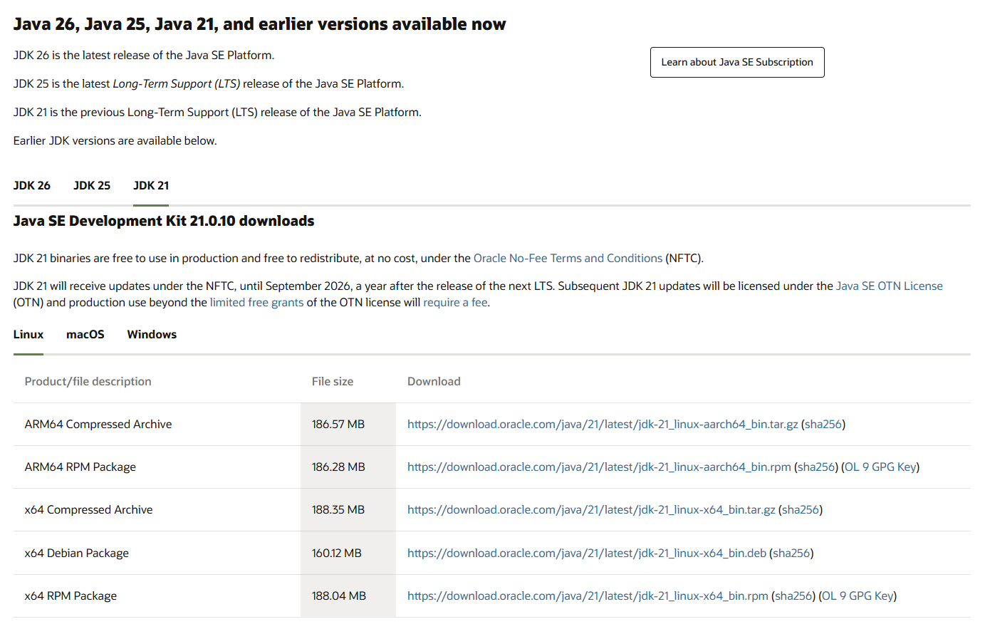 Oracle 공식 사이트(oracle.com/java/technologies/downloads)에서 Java 21 탭을 선택하고 OS에 맞는 설치 파일을 다운로드하거나, 아래 패키지 매니저를 사용한다.