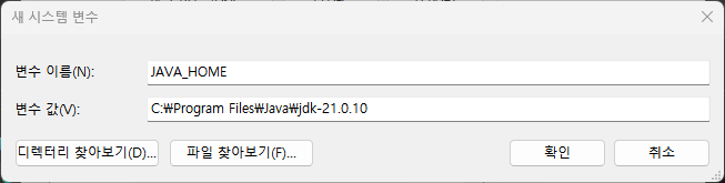 | 변수 값 | C:\Program Files\Java\jdk-21 |