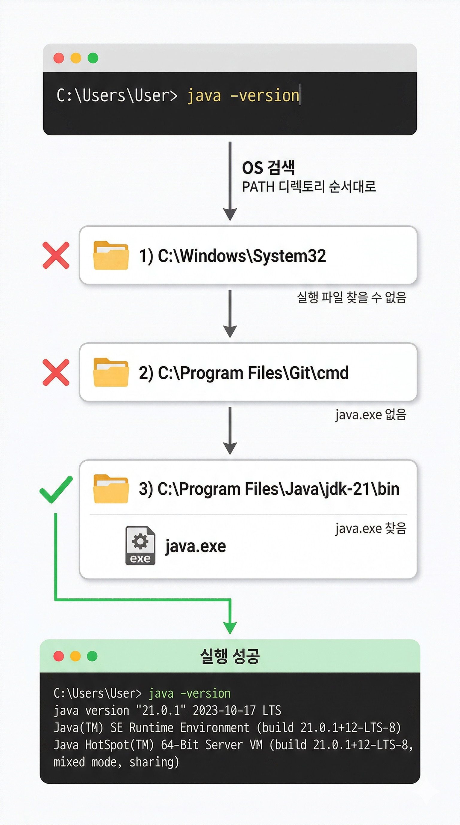 PATH는 운영체제가 실행 가능한 프로그램을 찾는 디렉토리 목록을 담는 환경변수이다. 터미널에서 java라고 입력하면, OS는 PATH에 등록된 디렉토리들을 순서대로 탐색하며 해당 실행 파일을 찾는다.